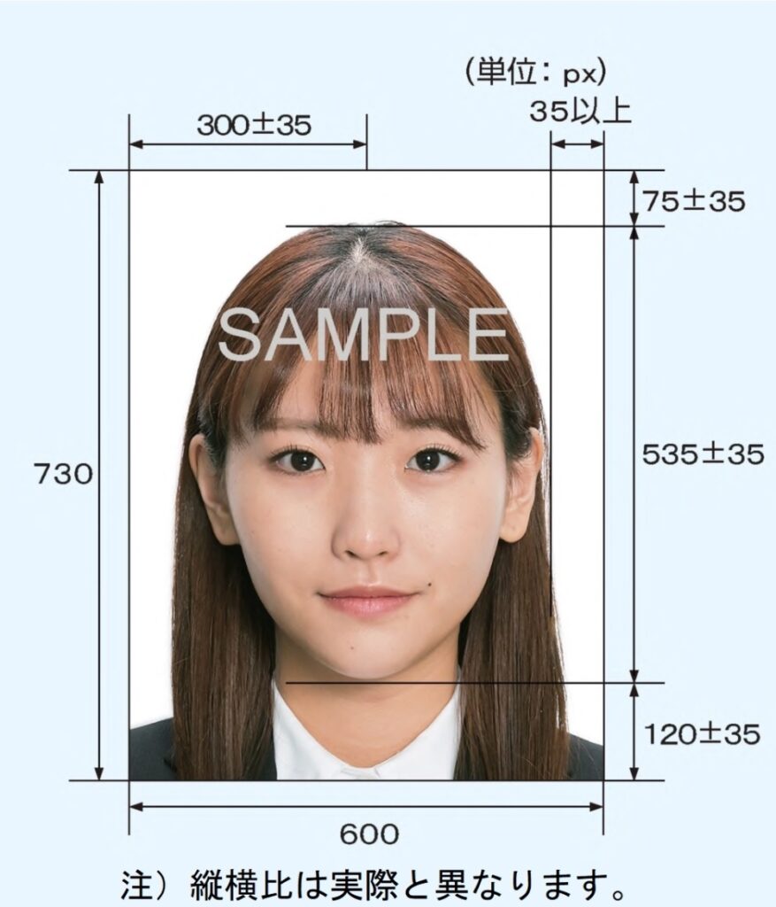 頭頂からあごまでの長さは535±35pxに収め、頭の上は75±35pxの余白をつくることが必要です。