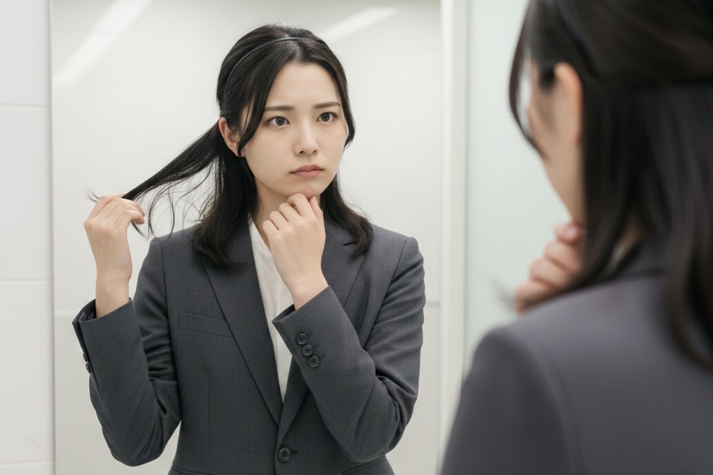 さらに、光の当たり方によって髪の広がりが目立ち、全体の印象が整って見えない場合があります。